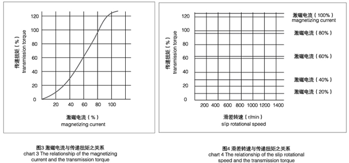 如圖3所示,傳遞的轉矩與激磁電流基本成線性關系。只要改變激磁電流的大小,便可在較大范圍內控制轉矩的大小。一般情況下在5%-100%的額定轉矩范圍內,激磁電流與傳遞轉矩基本成正比例線性關系。