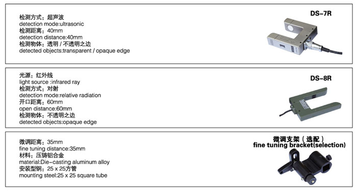 KS-C2型 光源色:綠/紅/白(選) 光斑直徑:1.2mm 檢測(cè)距離:12±2mm 檢測(cè)物體:線/色差 透明/不透明之邊 CDD-40N型 光源:紅外線 檢測(cè)方式:擴(kuò)散反射 檢測(cè)距離:12-400mm 檢測(cè)物體:透明/不透明之邊 DS-5R型 光源:紅外線 檢測(cè)方式:擴(kuò)散反射 檢測(cè)距離:12-400mm 檢測(cè)物體:透明/不透明之邊 DS-6R