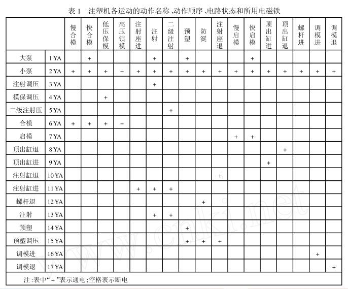 表1 注塑機(jī)各運(yùn)動(dòng)的動(dòng)作名稱、動(dòng)作順序、電路狀態(tài)和所用電磁鐵