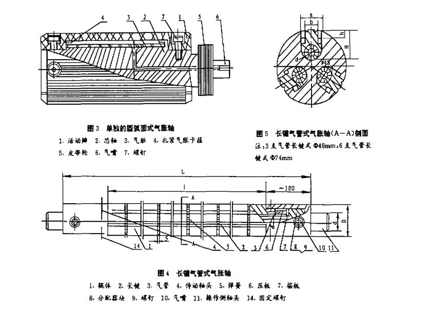 圓弧形金屬板)氣脹袖(圖3)是一種門幅較窄的氣動的芯管夾具,應用已有40 年的歷史,代替機械頂緊頭。它可以單獨或幾組組合起來串套在一支方軸或日軸上使用,從圖中知,單獨的其結構為一支短的芯軸,軸心鉆有通氣孔并配有氣嘴,中間部分套有一橡膠氣胎.艙兩端緊緊扎在軸的中間部分兩端,以防漏氣。膠胎外側為一組活動的弧形板,通常為4~6 塊,由鋁臺金制成。在長度方向表面銑有細紋,增加與接觸紙芯管內壁之間的摩擦力,兩端鉆有沉頭螺孔,用內六角螺釘與軸芯連接·并留有一定活動(徑向)余量。一旦通氣,橡膠胎膨脹,頂起活動弧形板,把外馨的芯管牢牢撐。S端連接方法可以是法蘭、皮帶輪及其它。