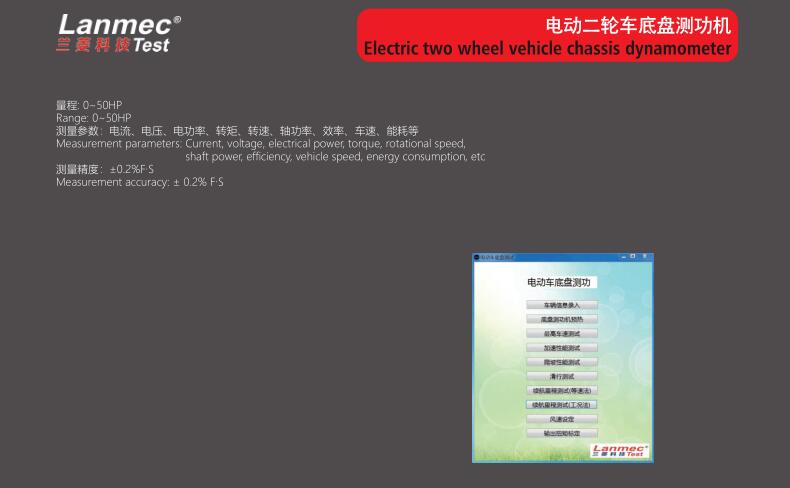 測(cè)量參數(shù):電流、電壓、電功率、轉(zhuǎn)矩、轉(zhuǎn)速、軸功率、效率、車速、能耗等