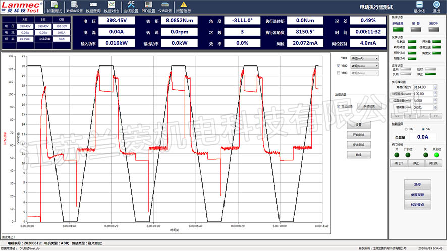 執(zhí)行器測試軟件是基于PC(Windows 7 SP1)用來測試執(zhí)行器性能的的數(shù)據(jù)采集軟件。測試軟件配合電參數(shù)儀表、轉(zhuǎn)矩轉(zhuǎn)速采集儀、程控加載儀等儀表可以對被測閥門進行手動加載、自動加載、曲線加載、定點測試、耐久測試等測試項目。 軟件具體功能如下: 5.1可顯示、保存、打印: 被測執(zhí)行器輸入的電流、電壓、功率因數(shù)、電功率 輸出的轉(zhuǎn)矩、轉(zhuǎn)速、功率;效率;旋轉(zhuǎn)角度 各參數(shù)及相互之間的曲線關(guān)系,并形成報表予以保存和打印 5.2 可以顯示:執(zhí)行器自帶的開度、扭矩傳感器顯示(2路4~20mA),并計算執(zhí)行器的死區(qū)。 5.3 可以發(fā)送指令控制執(zhí)行器的位置(4~20mA對應位置); 5.4 壽命測試,觸點輸出?梢园l(fā)送指令命令執(zhí)行器循環(huán)動作的啟動、停止;可面板和上位機切換控制執(zhí)行器的動作。 5.5加載方式:手動、程控加載預驗收(均由乙方免費提供) 整機驗收 甲方提供被測執(zhí)行器,安裝于成套測試臺,進行加載動態(tài)測試,觀察加載、顯示是否正常,有無異常振動、噪音。 乙方提供出廠資料: